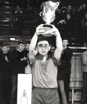1965年王家声获得国际乒乓球锦标赛男子单打冠军后,高举奖杯向观众致意。