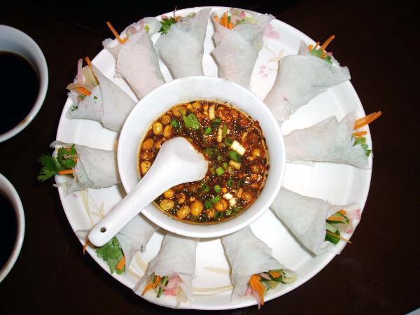 用米面粉做成薄纸状小圆饼,烙熟,将萝卜丝、折耳根、绿豆芽、海带丝、炸黄豆、 糊辣椒等多种佐料,包在面皮裹成小卷食用,别名素春卷。口感绵着四溢,极富特色。制作方法:烙。面粉加水,盐少许揉匀挪透(水与面粉比例为1:6),平锅烧热刷油、擦干,然后左手抓起面团甩圆并向锅底杵一下成为直径为9厘米的圆薄皮时,右手立即把圆形面皮揭起,这样制作数十张春卷皮,放入蒸笼稍蒸一下使其回软,便于包食。再将绿豆芽、海带丝、芹菜节、蕨菜节用开水氽过,分别装入小盘中,小碗内放入酱油、醋、味精、麻油、姜沫、葱花、煳辣椒兑成汁。春卷皮中放入各种素菜丝包成上大下小的兜形,放入酥黄豆,浇淋兑好的辣椒汁即成。 风味特色:素菜脆嫩,酸辣爽口,开胃健脾。是流行于贵阳的名小吃。