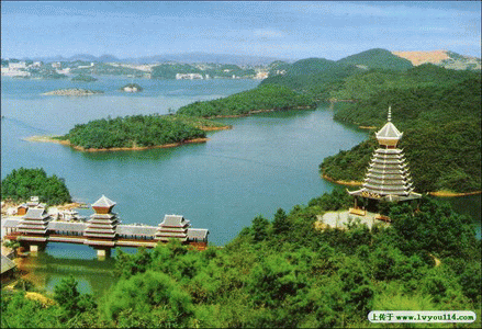 红枫湖的整体美还可以从空中鸟瞰。在5 000米以上的高空俯视,它像一位羞涩的少女静卧在群山的环抱中,湖中散布的小岛像少女的首饰和项上的花环。湖水拍岸,那连绵的浪花像少女的白色裙边,几组造型别致的建筑群像艺术品一样点缀在伸入湖中的半岛上,南面几座雄伟的大山顶上常冒起几柱不散的白色烟云,像“天公”赐予少女的素绢。阳光照射,整个湖面波光粼粼,高原明珠的美誉由此而来。有的朋友可能会问,这座贵州高原最大的人工湖,为什么以“红枫”命名,它建于何年?原来湖底是什么模样?