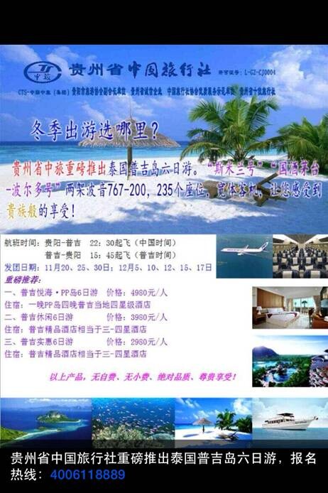 中旅简讯:贵州省中旅重磅推出泰国普吉岛包机六日游。“斯米兰号”“国酒茅台号—波尔多号”两架波音767-200机型,235个座位,宽体客机,让您感受到贵族般的享受!